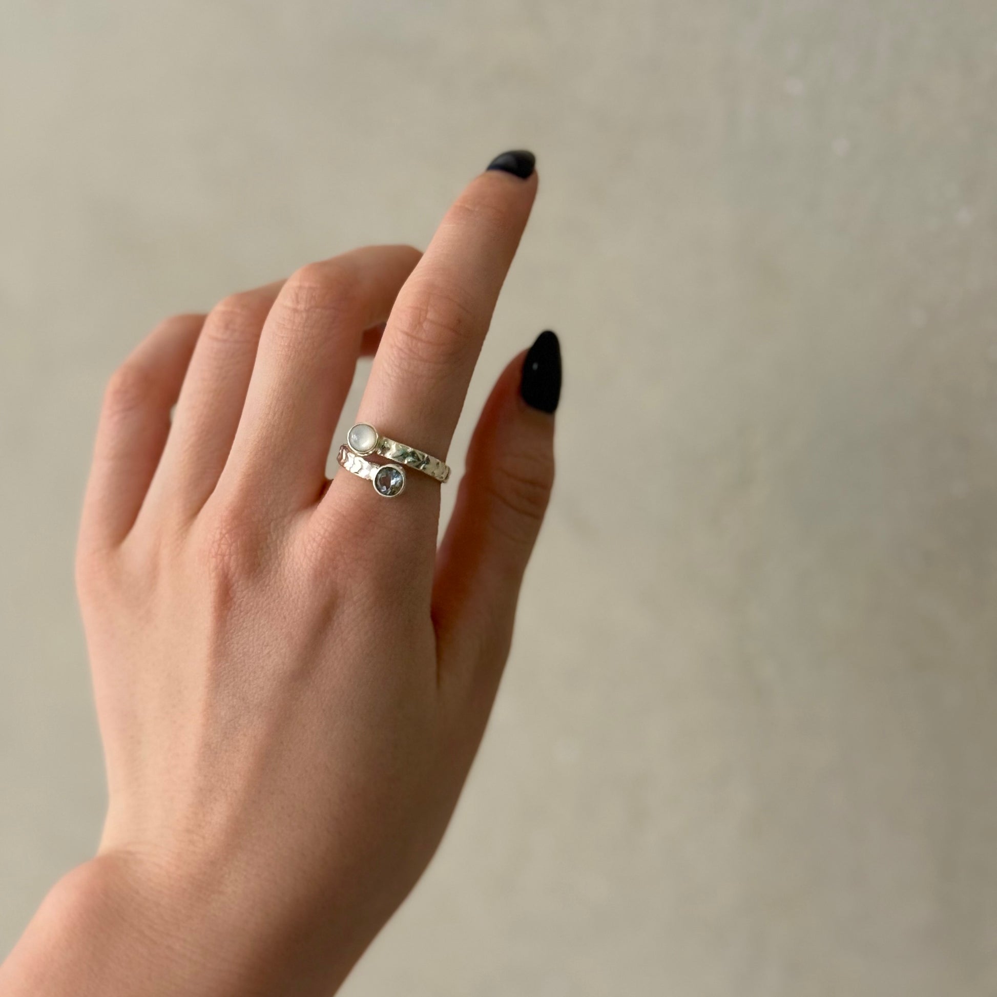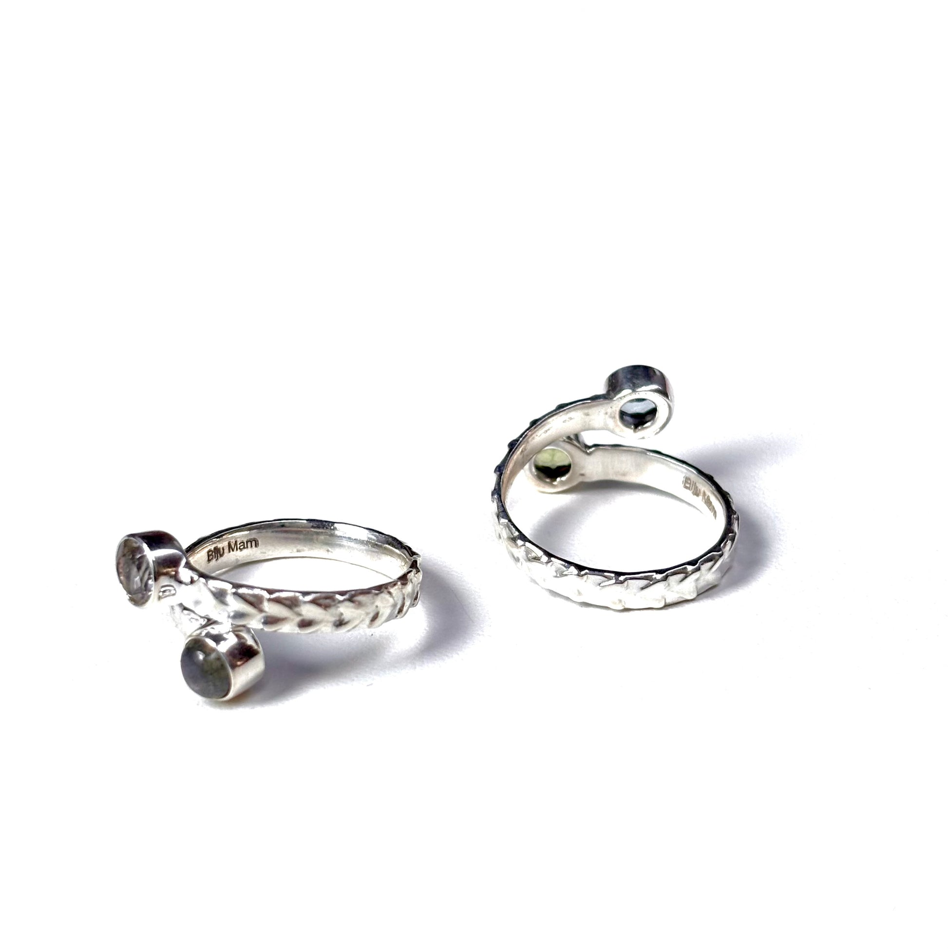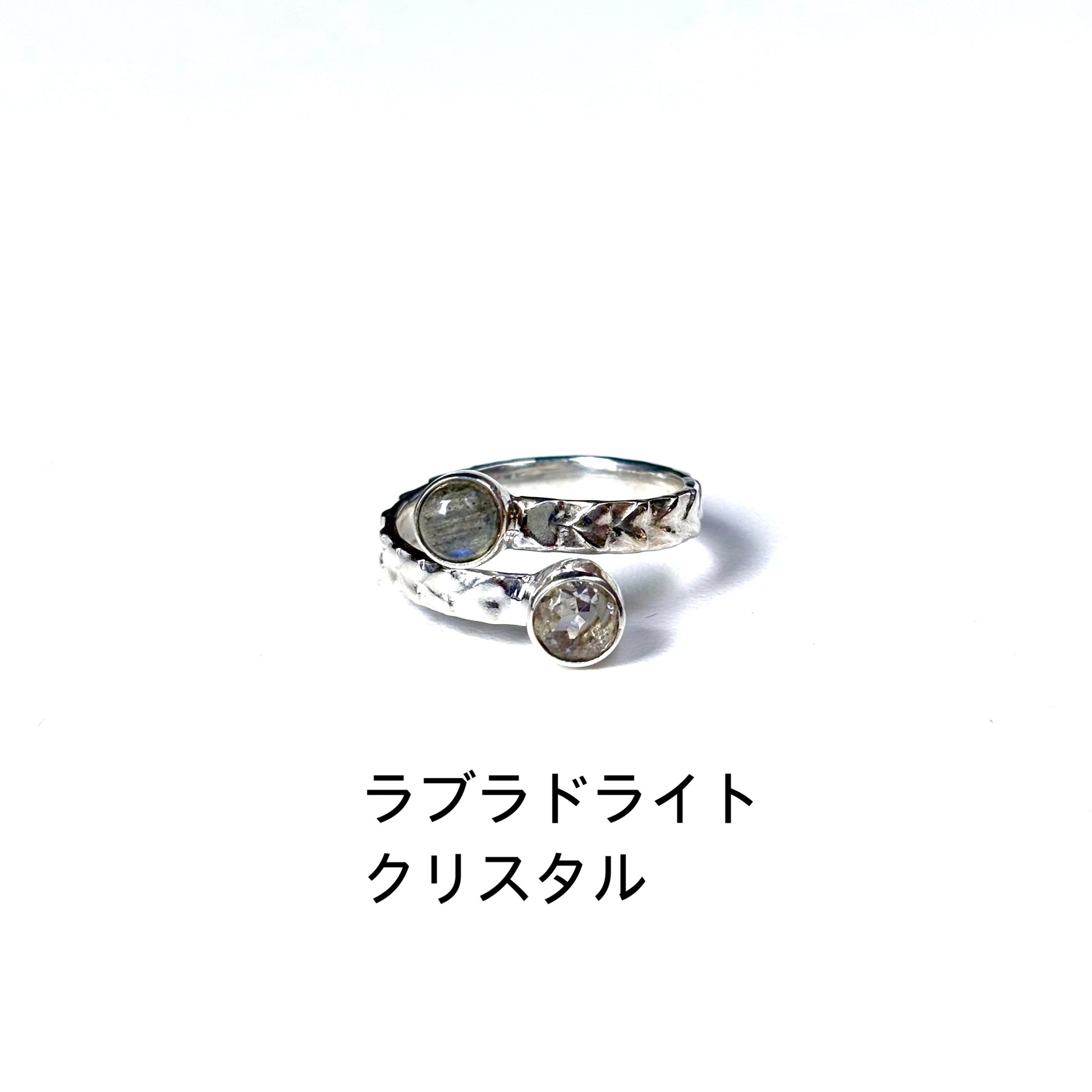 異なるカラーの天然石が2粒付いたデザインリング。
