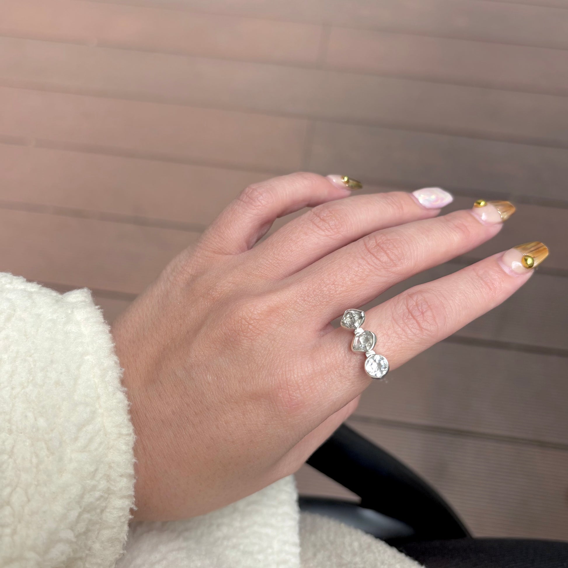3粒の天然石が輝くデザインリング。