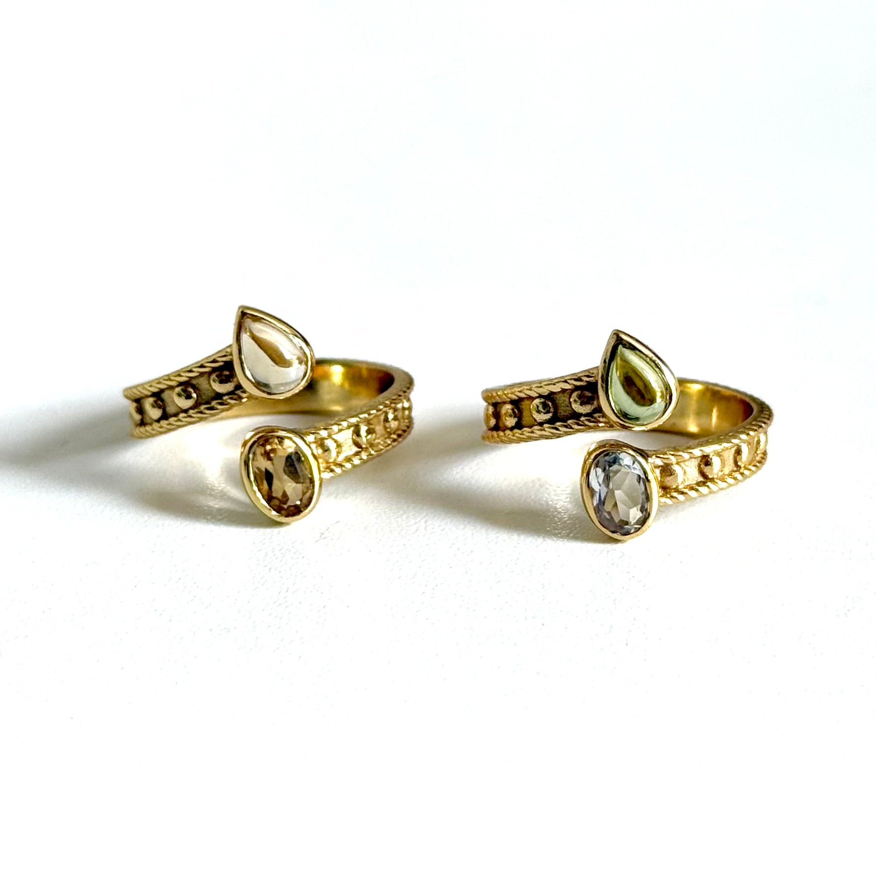 カット・カタチ違いの2つの天然石がアクセントになり、サイズも調節できるのでギフトにもオススメ!