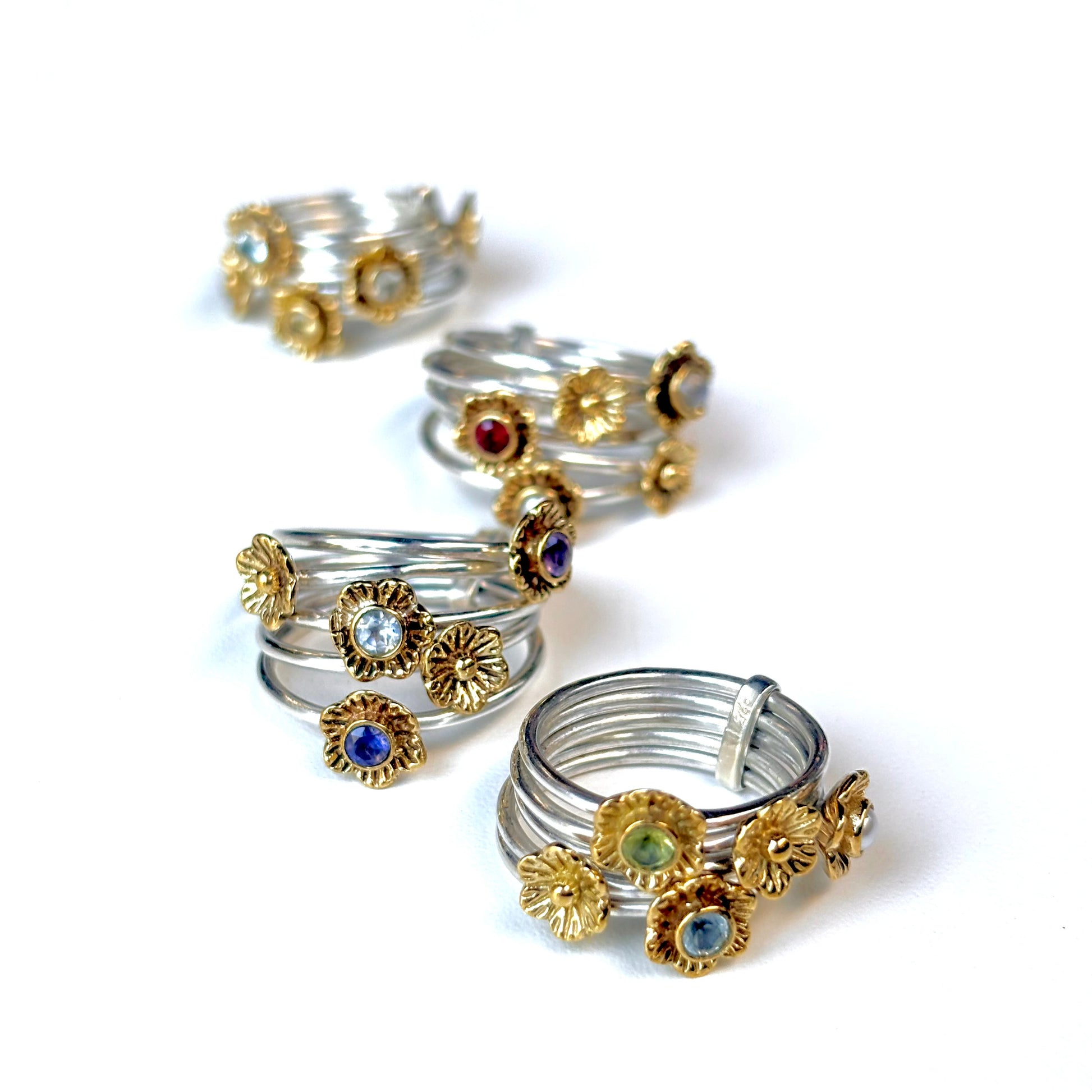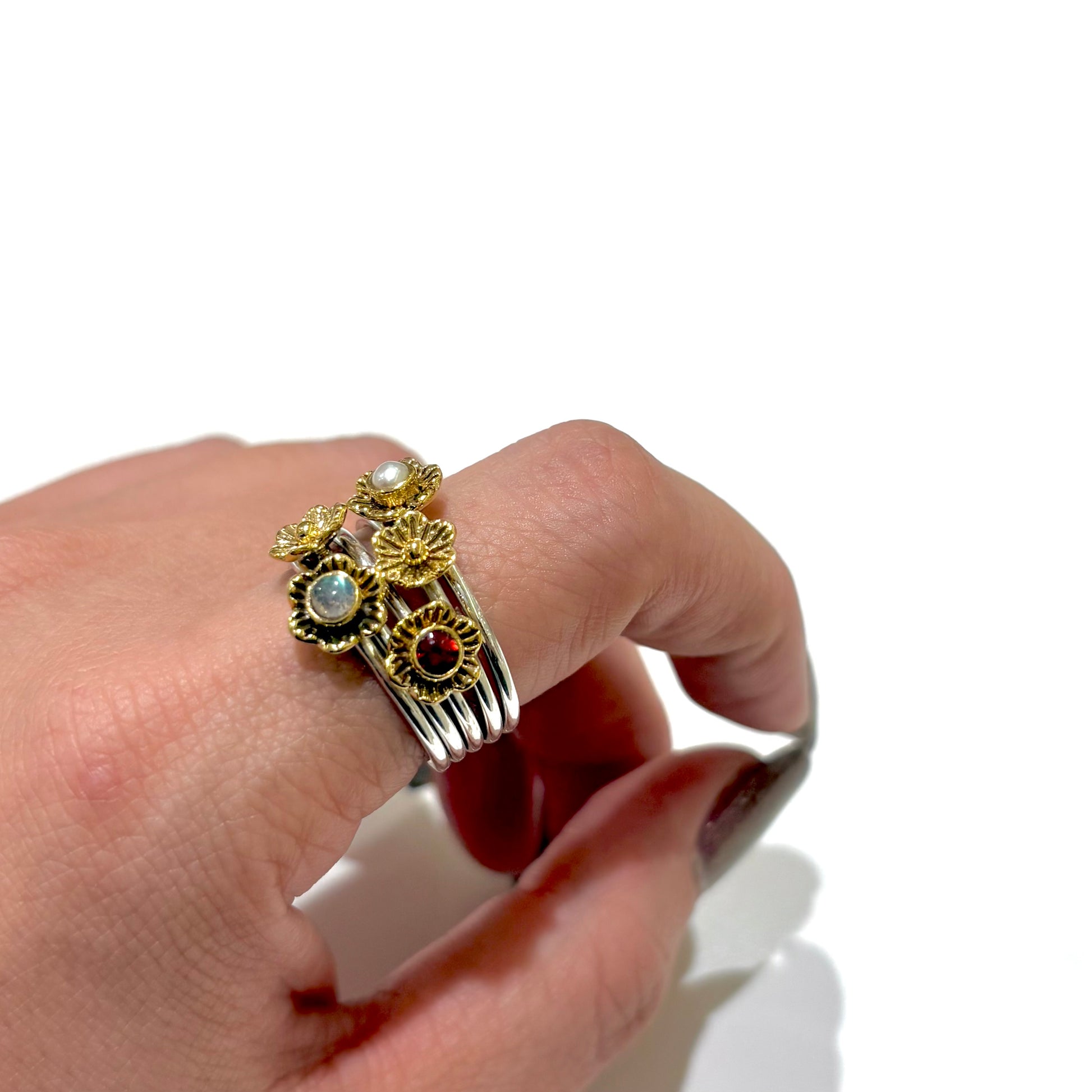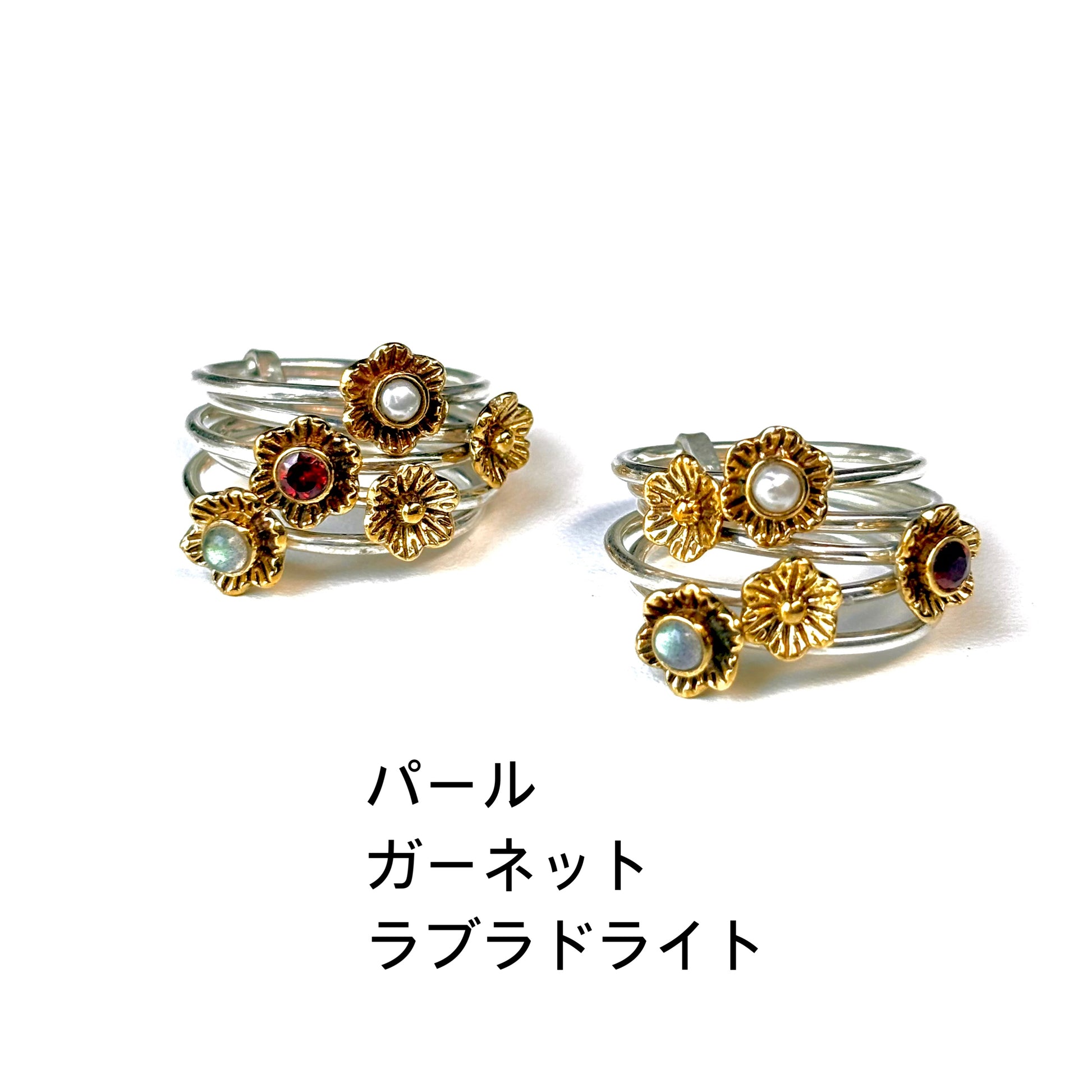 キラリと輝く天然石付きのフラワーと、プレーンリングが重なり