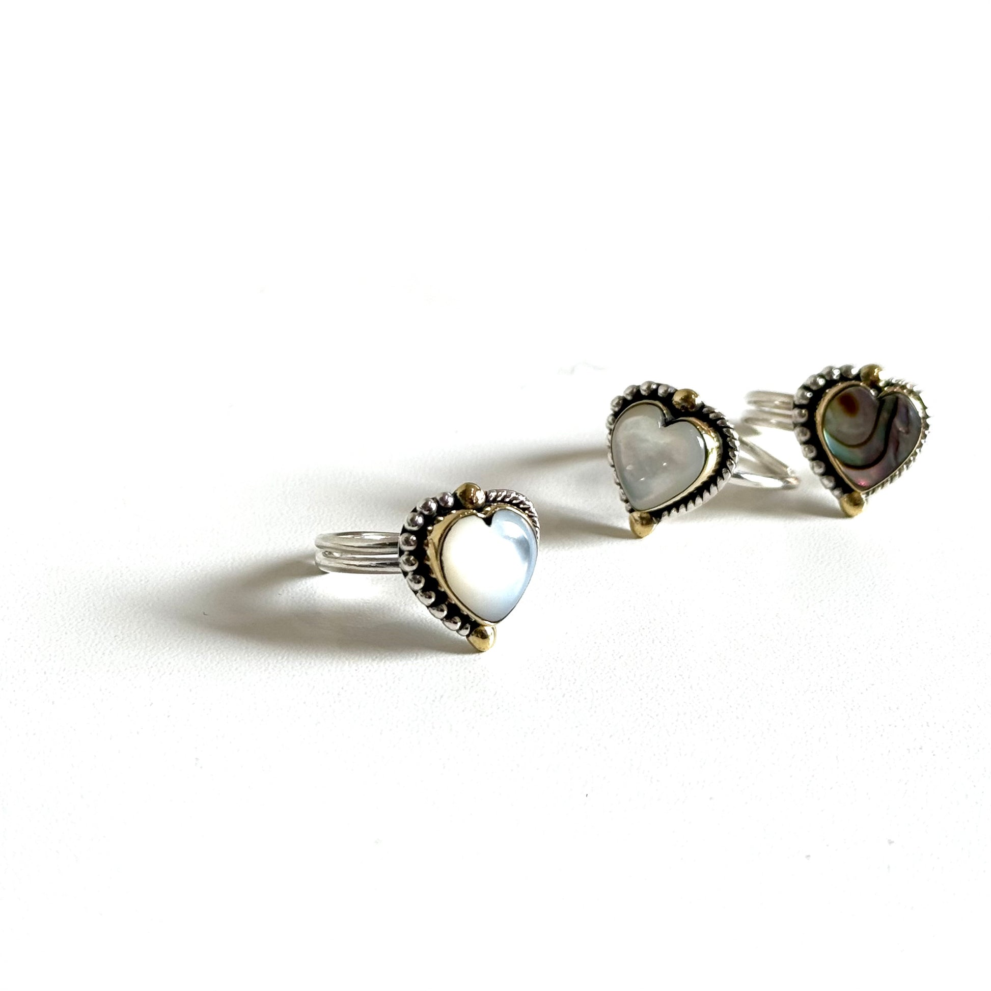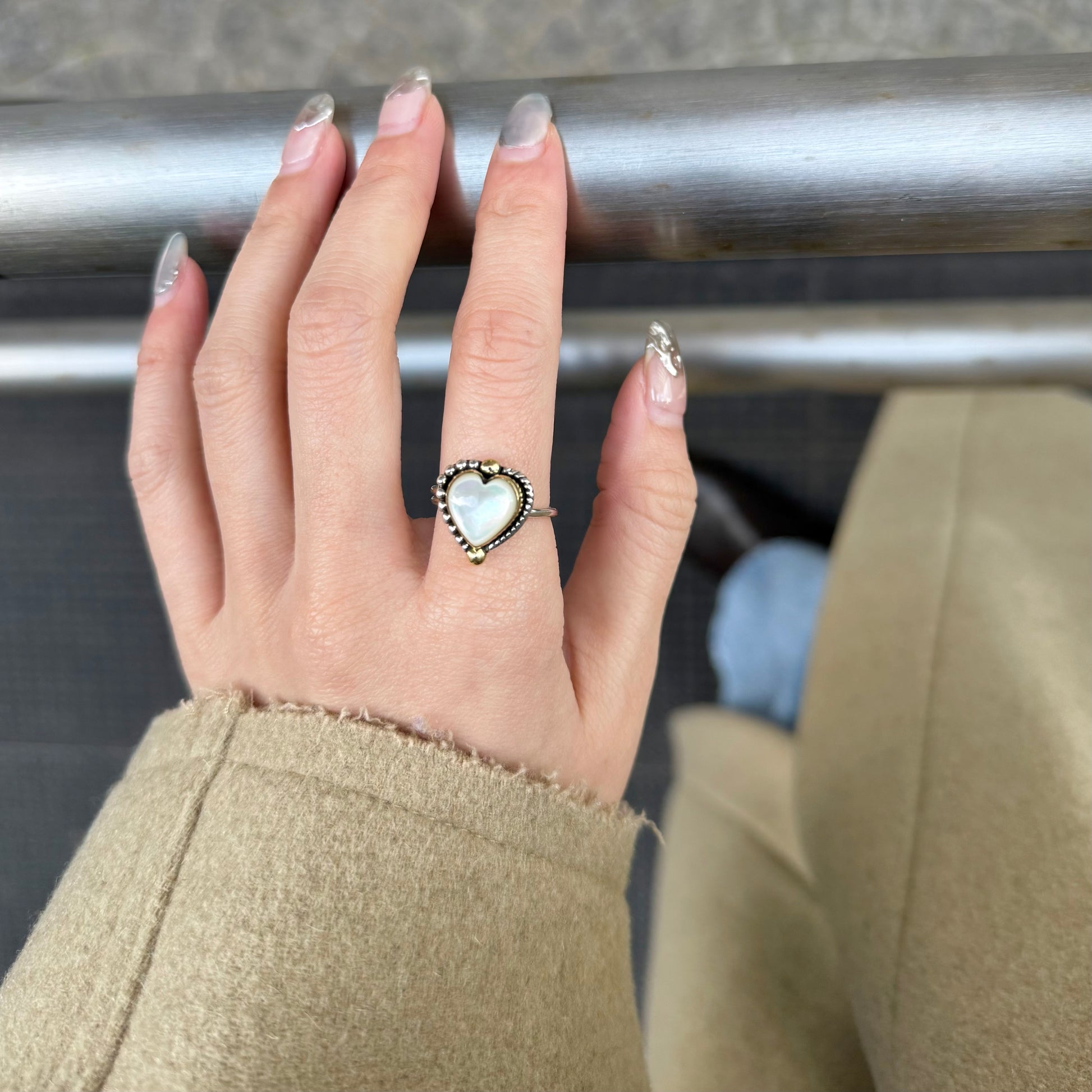 ハート型の天然石と石を囲む、バイカラーの装飾が目を引くデザイン。