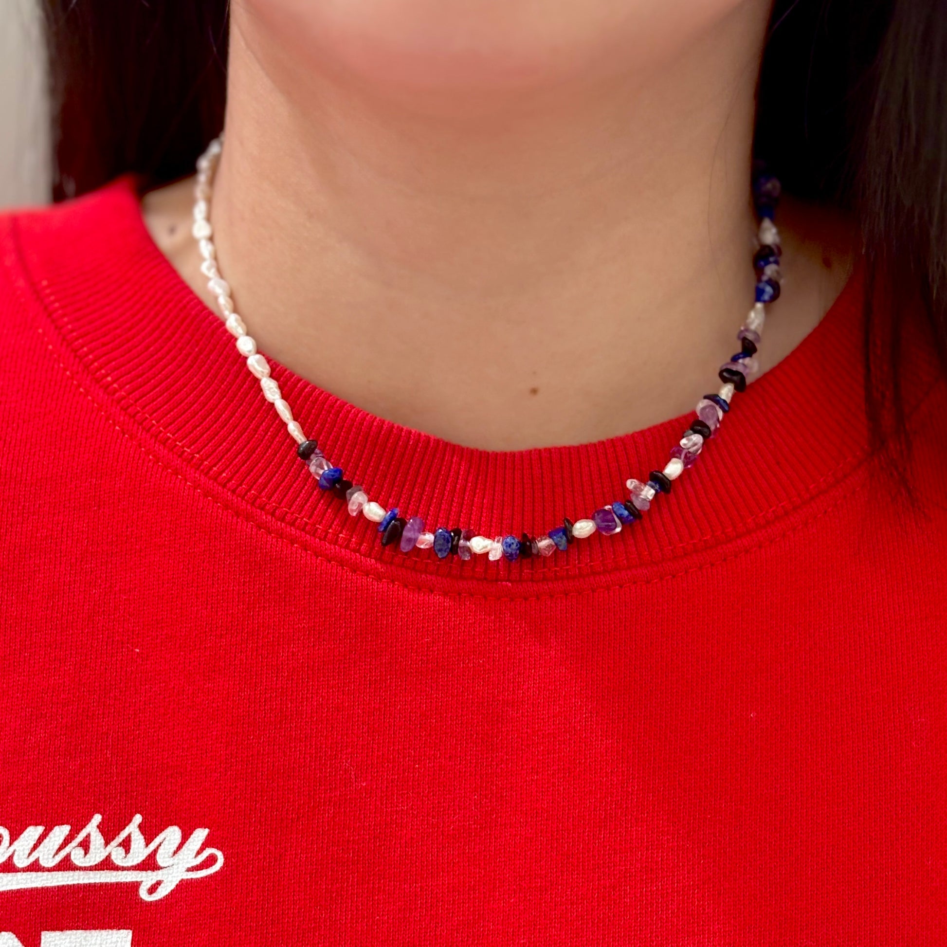 パールとカラフルな天然石を半分ずつあしらったネックレス。
