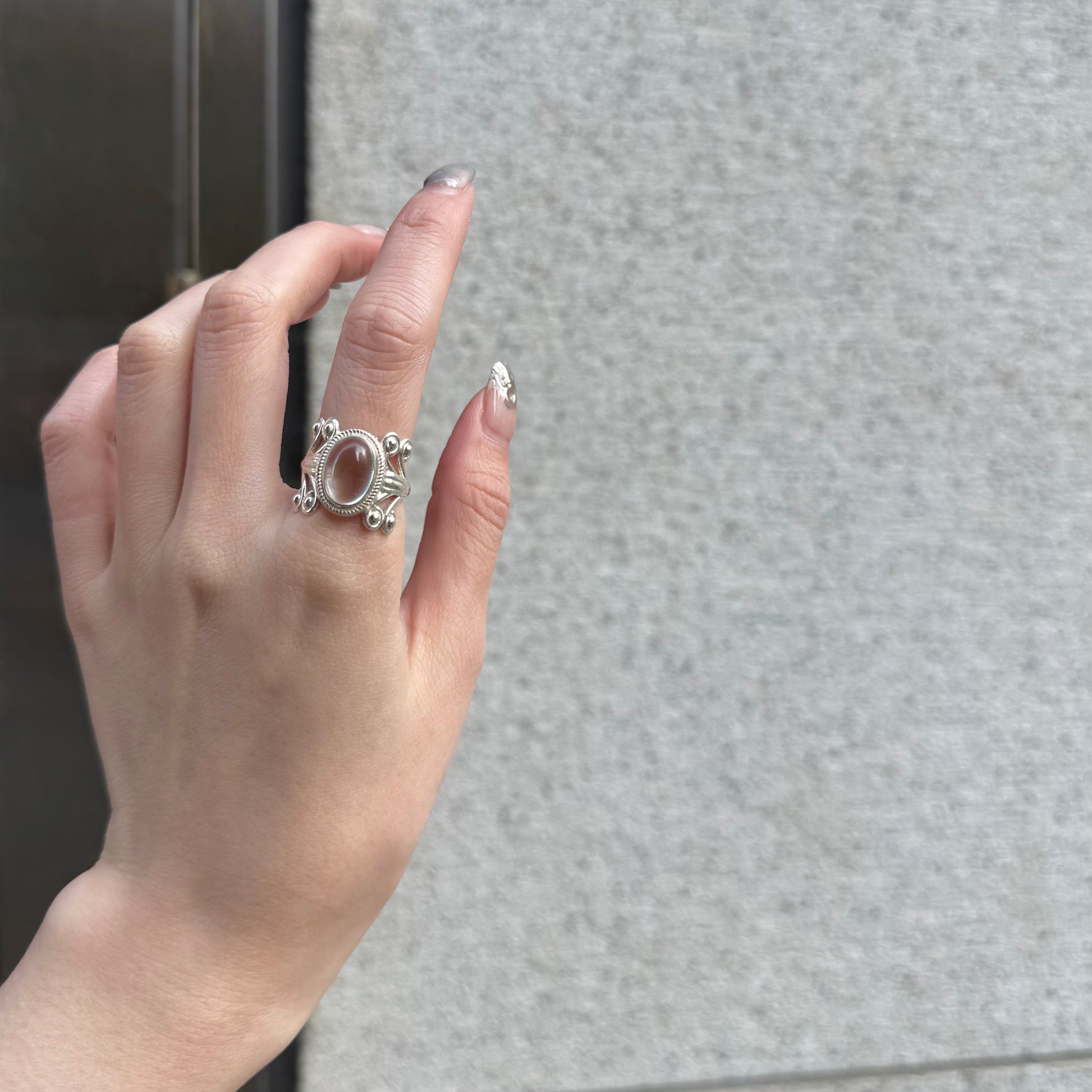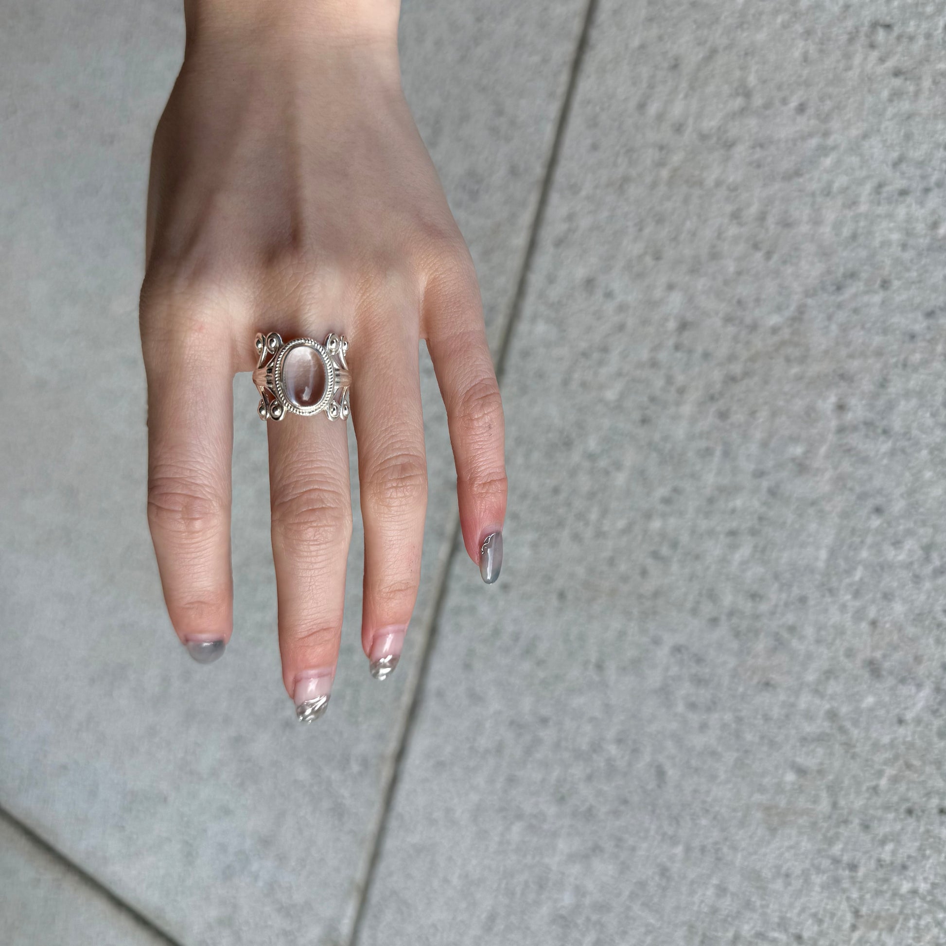 大ぶりのオーバル天然石が美しい、クールなシルバーリング。